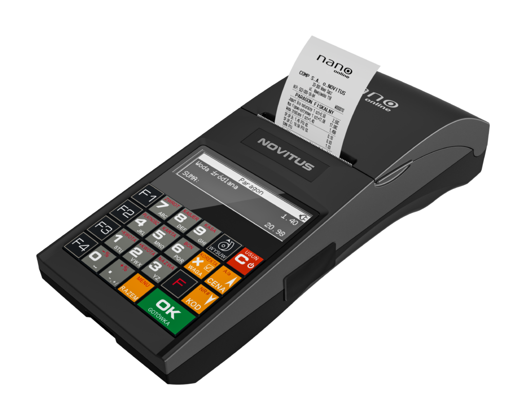 NANO online to wszechstronna kasa, dedykowana zarówno do pracy stacjonarnej jak i w terenie, w usługach oraz średnich i małych placówkach handlowych. Zaufaj marce, używanej przez ponad 900 000 użytkowników. Jest to najmniejsza kasa fiskalna w ofercie NOVITUS, która jednocześnie obsługuje komunikację z Centralnym Repozytorium Kas (CRK), zgodnie z wymogami Rozporządzenia Ministra Przedsiębiorczości i Technologii z dnia 28 maja 2018 r. w sprawie kryteriów i warunków technicznych, którym muszą odpowiadać kasy rejestrujące. Kopia wydruku dla użytkownika przechowywana jest w pamięci chronionej urządzenia, a dostęp do niej jest realizowany poprzez dedykowaną aplikację.