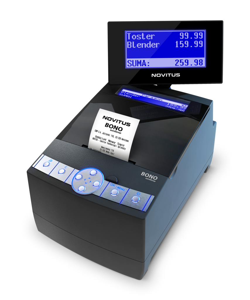 Bono Online z programem w wersji 300 (Decyzja Prezesa GUM ZPT 5/2025 ) to kolejne urządzenie w ofercie Novitus należące do rodziny ONLINE 3.0 zapewniającej współpracę bezpośrednio z HUBem paragonowym Ministerstwa Finansów, pozwalającym na bezpłatne przesyłanie klientom e-paragonów do aplikacji e-Paragony. Przesyłanie klientom paragonów w formie elektronicznej (e-Paragon) to rezygnacja z papierowego wydruku i oszczędność papieru, a dzięki temu niższe koszty użytkowania urządzenia. Współpracuje z wieloma komercyjnymi systemami sprzedaży obsługującymi e-paragony, w tym wieloma pracującymi w e-commerce. Urządzenia Novitus jako jedyne oprócz obowiązkowego e-paragonu w zaszyfrowanym formacie JWS przesyłają również czytelny obraz paragonu w formacie PNG. Urządzenia Novitus mogą również oprócz e-paragonów wysyłać klientom e-faktury i e-dokumenty niefiskalne (np. reklamowe) zawierające również grafikę.