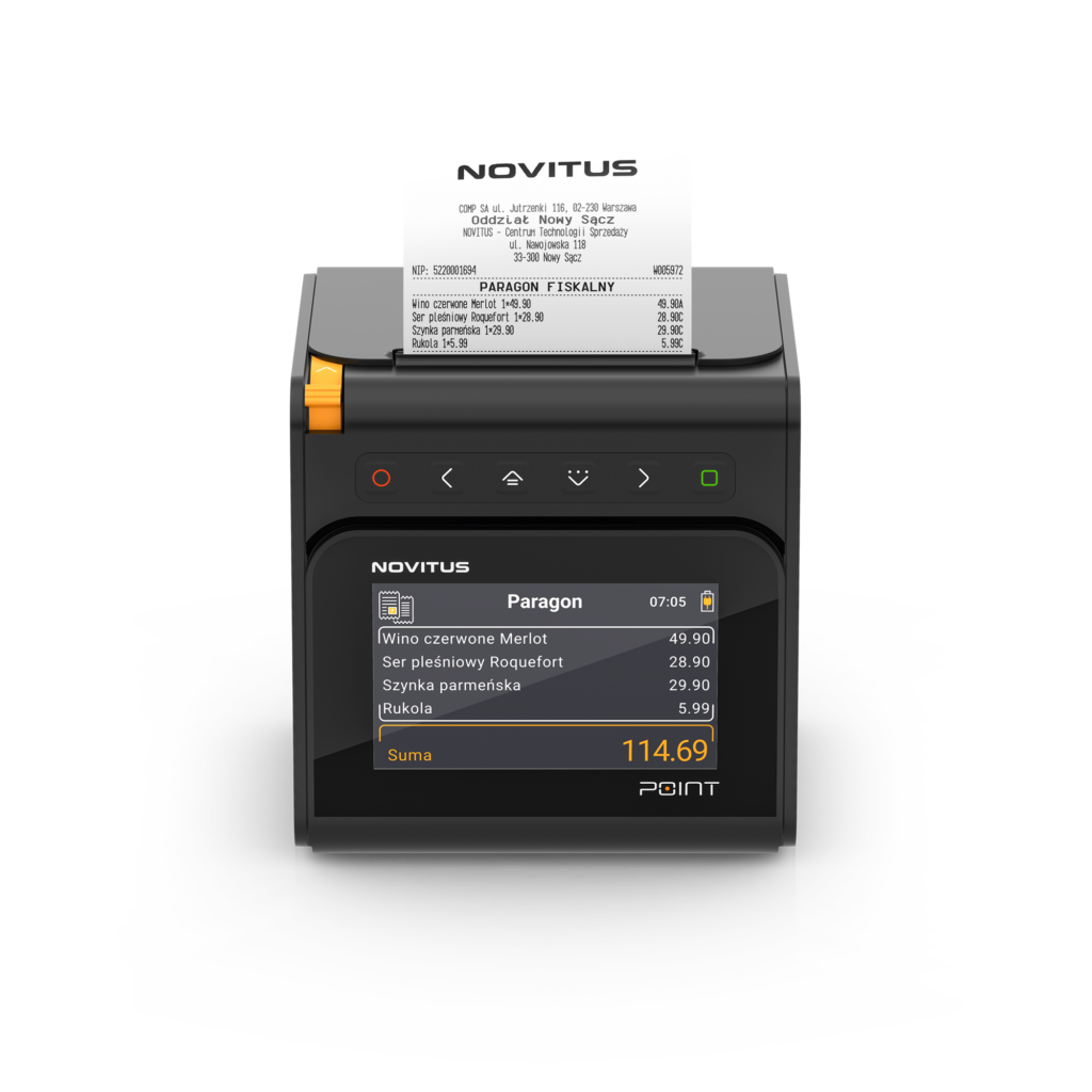 Drukarka Novitus POINT to najnowsza drukarka fiskalna marki Novitus dedykowana dla Twojego biznesu. Drukarka została wyposażona w szereg innowacyjnych funkcji oprogramowania oraz rozwiązań technologicznych. Oprócz wysokiej jakości mechanizmu drukującego zapewniającego bardzo szybki wydruk i precyzyjnego obcinacza papieru drukarka, wyposażona jest w kolorowy wyświetlacz prezentujący zawartość paragonu i nazwy sprzedawanych towarów lub (również graficzne) menu drukarki. Drukarka pracuje w dwóch pozycjach: podnoszonym wyświetlaczem skierowanym do góry i w stronę klienta, a mechanizmem drukującym wydającym papier w stronę obsługi, lub mechanizmem drukującym do góry, a wyświetlaczem klienta zwróconym do przodu. Każdy może dopasować położenie jej pracy do własnego stanowiska sprzedaży.